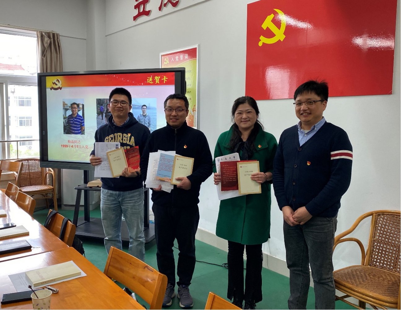 本次活动为四月份加入中国共产党的三位教师梅磊、杨静和郗焕举办了简朴庄重的集体政治生日仪式,梅丹华代表党支部为三位同志赠送精心准备的专属政治生日贺卡及《共产党宣言》,并送交了入党申请书复印件,三位老师手捧近20年前的入党申请书,深情回顾了入党初心和成长历程,发表了政治生日感言,纷纷表示将不忘初心,坚持立德树人根本任务,争做优秀共产党员的决心。