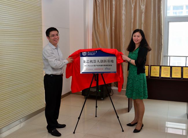 随后,谢经理与王书记共同进行了揭牌仪式,测控技术与仪器专业负责人王晓荣副教授代表系接收了龙众创芯公司捐赠的30套龙芯机器人控制器,同时龙众创芯公司授权公司为RT-Thread实时操作系统实训站,并向参与培训和创客工作的老师和员工颁发了RT-Thread认证讲师和龙芯创客证书。今后,公司与龙众创芯将共建“机器人设计实验室”、“南工龙芯机器人创新基地”及“RT-Thread实时操作系统实训站”,以此为依托进行多个龙芯机器人原型的研究及其他相关科研活动,双方合作推广龙芯嵌入式技术认证和实时操作系统(RT-Thread/Rt-Loong)技术认证。并对通过认证的员工优先向各个龙芯和嵌入式系统开发需求企业推荐。