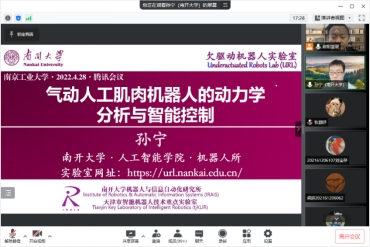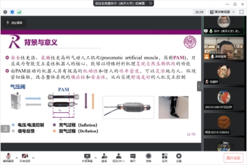 4月28日上午,南开大学百名青年学科带头人孙宁教授应邀线上与公司进行学术交流,作题为“气动人工肌肉机器人的动力学分析与智能控制”的学术报告。报告会由太阳成集团tyc33455cc副经理欧阳慧珉主持,公司全体研究生参加了报告会。