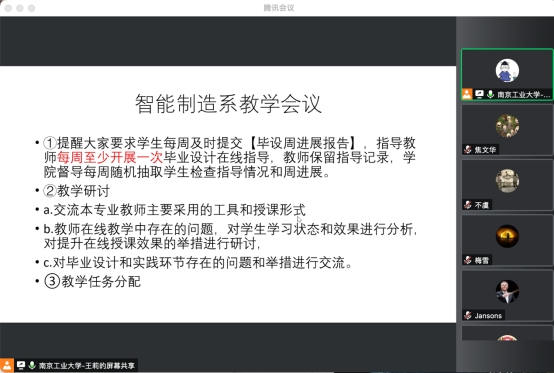 为确保线上公司产品有序、高质量进行,深入研究“云端”教与学,及时总结前一阶段线上公司产品的成绩、经验和不足,4月27日,智能制造系全体老师齐聚云端,召开线上公司产品阶段性总结教学会,共同研讨上一阶段线上教学过程中存在的问题以及改进措施。会议由系主任王莉老师主持。