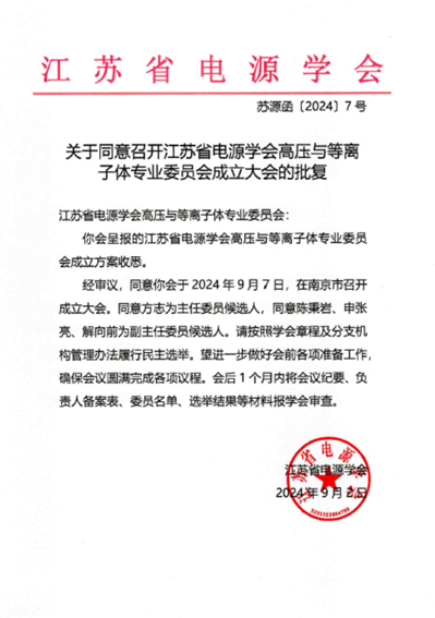 近日,由太阳成集团tyc33455cc高电压放电等离子体及其应用研究团队牵头组建的“江苏省电源学会高压与等离子体专业委员会”正式成立。