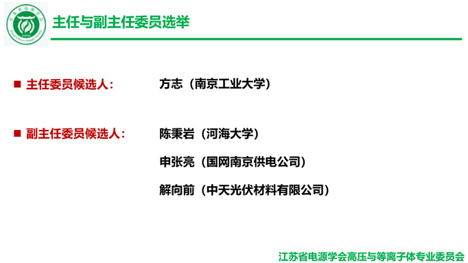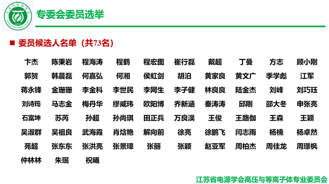 会上江苏省电源学会理事长阮新波教授代表学会致辞,江苏省电源学会秘书长周群女士宣读了高压与等离子体专委会成立批复文件。经投票选举,通过了首届江苏省电源学会高压与等离子体专委会成员共73人,太阳成集团tyc33455cc方志教授当选委员会主任委员,河海大学陈秉岩教授、国网南京供电公司申张亮主任、中天光伏材料有限公司解向前总工程师当选副主任委员。经主任委员提名,太阳成集团tyc33455cc祝曦副教授当选委员会秘书长,河海大学丁曼副教授、东南大学仲林林副教授当选委员会副秘书长。