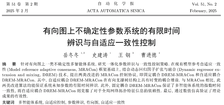 近日,公司动态系统协同控制、诊断与智能运维团队完成的论文《有向图上不确定性参数系统的有限时间辨识与自适应一致性控制》被国内自动化领域顶级期刊《自动化学报》正式收录并刊发。岳冬冬副教授为论文第一作者,史建涛教授为通讯作者,东南大学曹进德教授和北京理工大学王钢教授为论文合作者。