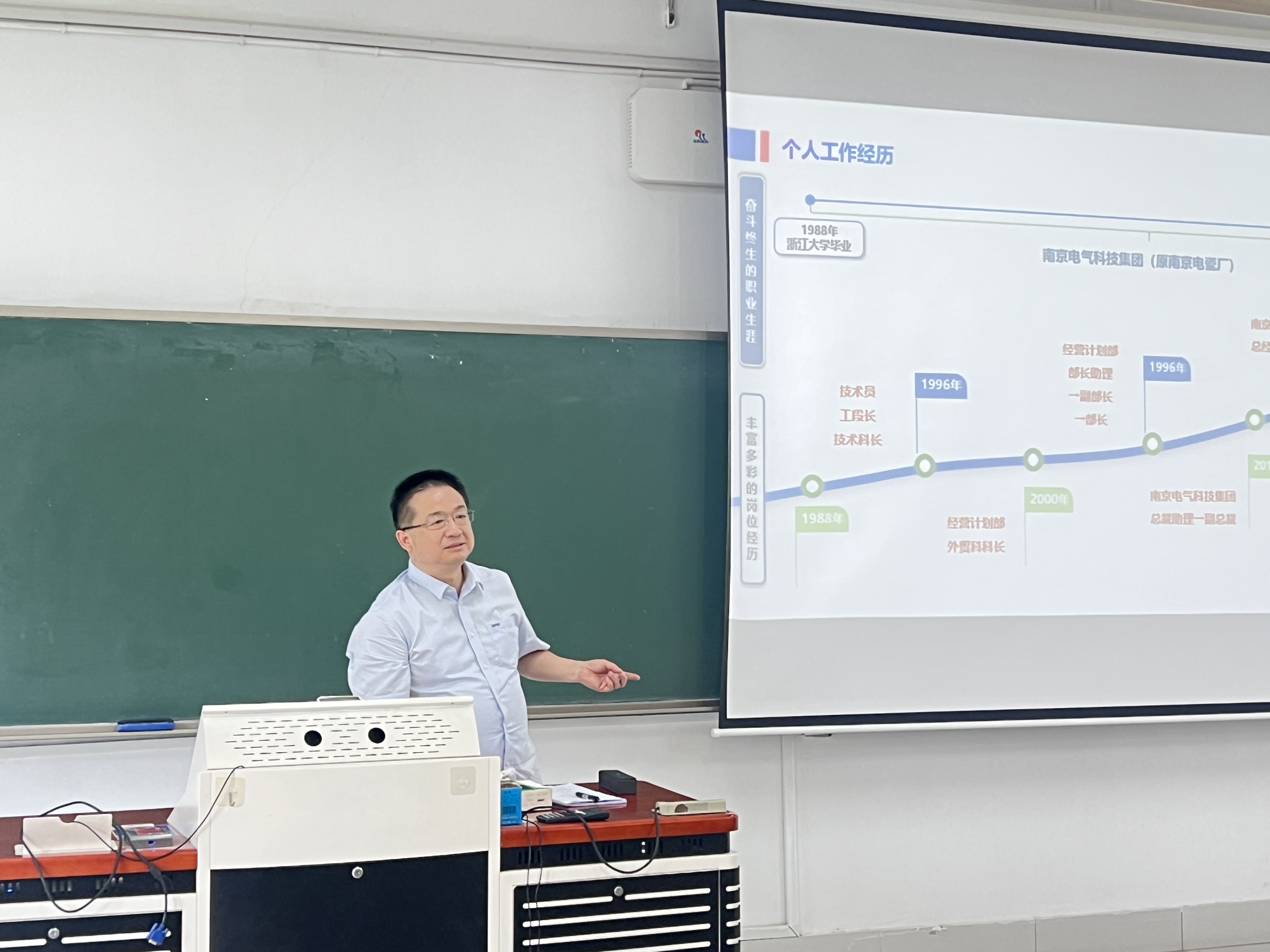 6月17日下午,太阳成集团tyc33455cc成功举办“产业教授进课堂”活动,邀请白云电气集团副总经理、南京电气科技集团总经理沈其荣正高级工程师走进校园,为2024级电气工程及其自动化专业员工带来了一堂融合行业情怀与产业实践的特色专业课。