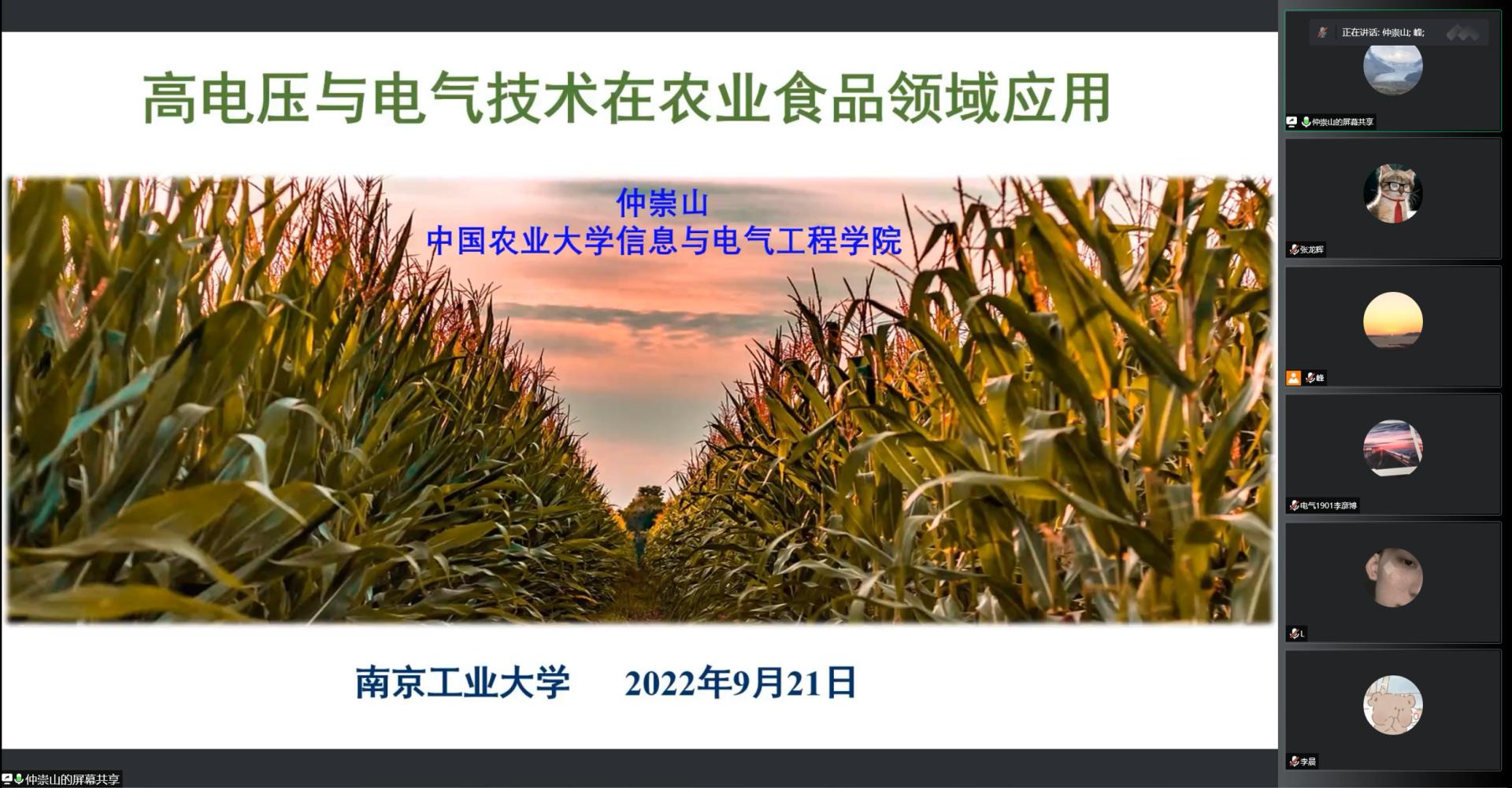9月21日上午,中国农业大学信息与电气工程公司仲崇山副教授应邀在“高电压新技术及其应用”课堂上在线为2019级电气专业本科生,及公司部分高电压方向教师、研究生做了题为“高电压与电气技术在农业食品领域应用”的学术交流报告。报告会由太阳成集团tyc33455cc刘峰教授主持。