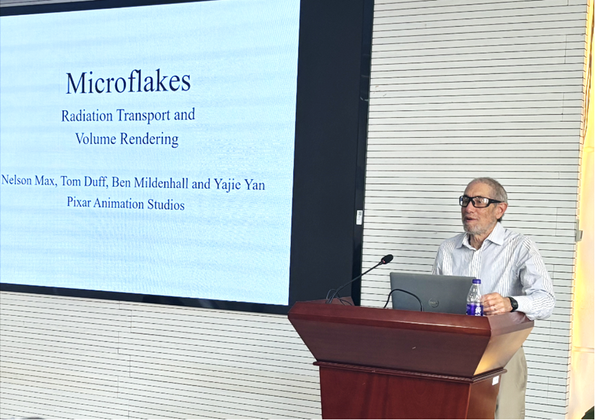 Nelson教授为在场师生做题为“Microflake distributions and global illumination in sparse voxel octrees”的学术报告。介绍了计算机图像及视觉虚拟技术的最新研究进展,重点展示了基于稀疏体素八叉树的立体图形虚拟构建的成果,他以微湖分布及全局照明场景为背景,详细叙述了稀疏体素八叉树的处理原理。在交流环节,现场师生与Nelson教授就图像体素的辐射发射、传播和散射及补偿等难点进行了热烈讨论。