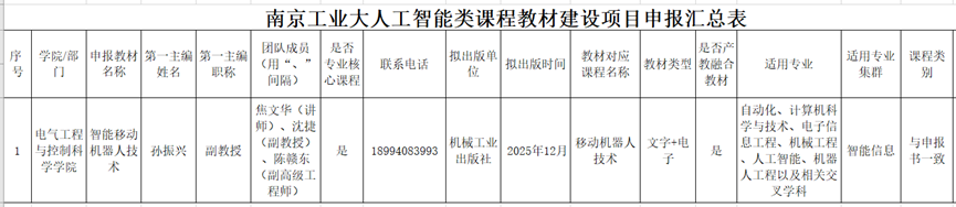 根据公司《关于开展太阳成集团tyc33455cc首批人工智能赋能高等教育优质本科教学资源立项建设工作的通知》有关要求,经申请人申报、公司教材建设与管理小组审核,申报人孙振兴同志政治立场坚定,能坚持正确的学术导向,学术功底扎实,遵纪守法,有良好的思想品德、社会形象和师德师风,同时有足够时间和精力从事教材编写工作。拟同意孙振兴同志新编《智能移动机器人技术》教材。具体信息如下,现予以公示: