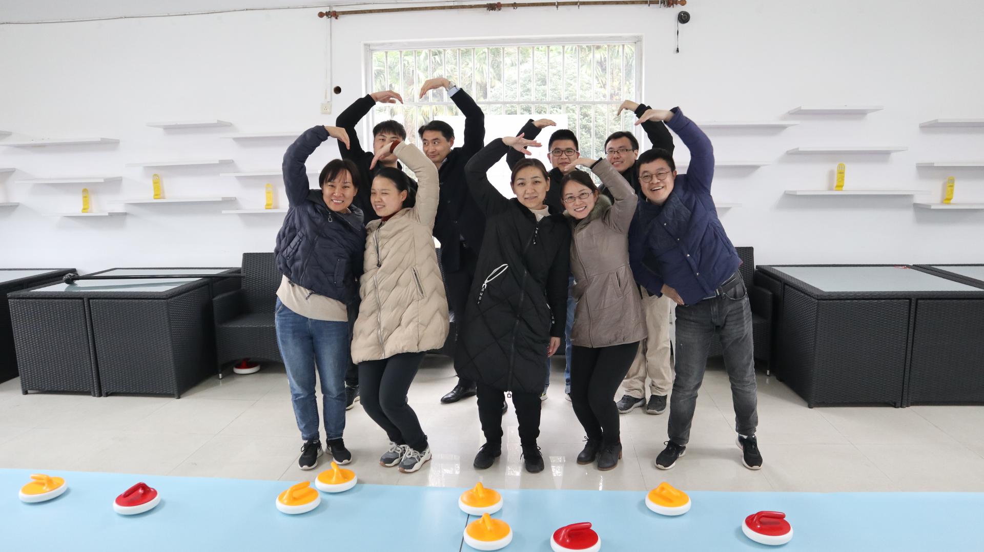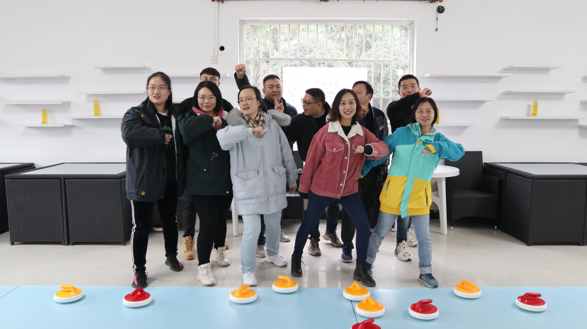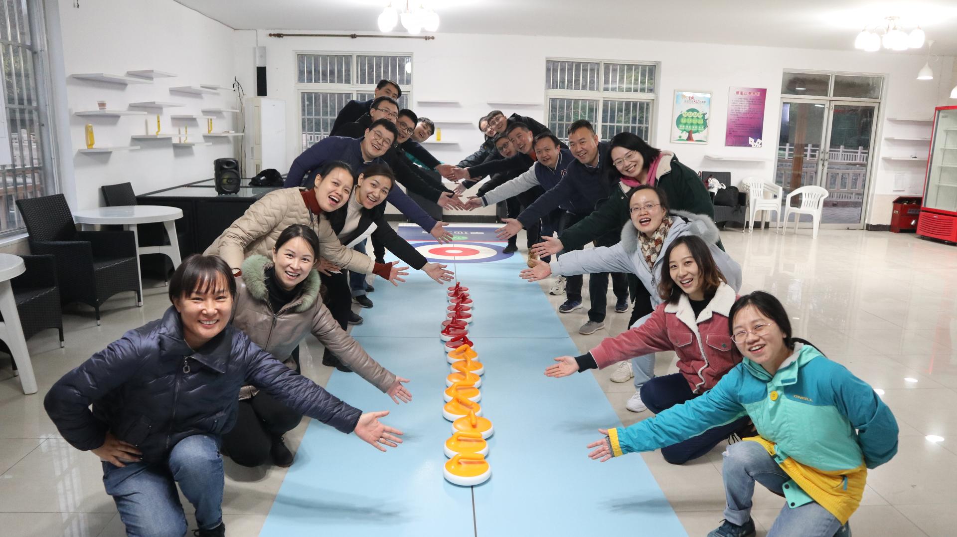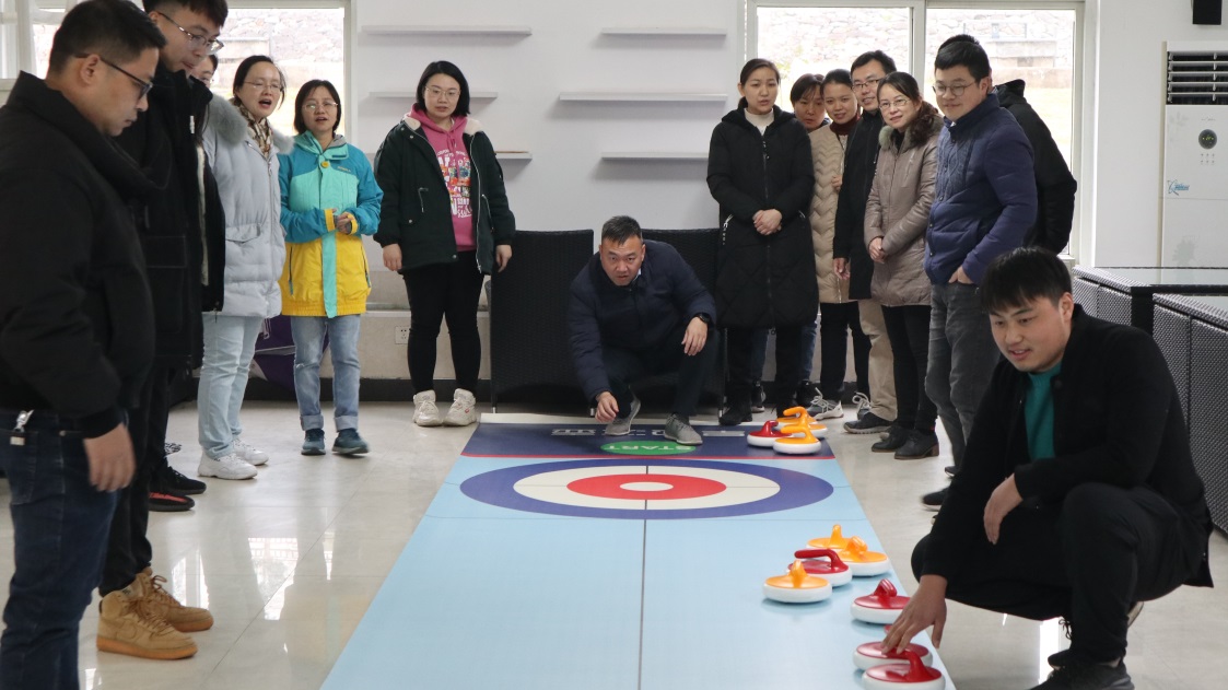 拓展活动从“团队建设与个性展示”开始,意在打破原有专业、教研组和部门界限,营造热烈浓郁的团队氛围。通过听指令快速分组的形式,参加培训的教师分成2组并选出队长。通过讨论2组分别展示团队名称、形象及LOGO,斗志昂扬的大喊出团队口号。随后,两队进行了《旱地冰壶》活动,冰壶是一项体力与智力相结合、趣味性很强的投掷类运动,集运动、娱乐、智慧和对抗于一身,静中有动,文雅中蕴藏对抗。在教练讲解完规则以及冰壶运动历史之后,2组队员先进行适应性攻防训练,一边进行投壶训练一边商讨制胜决策,然后进入到团队积分赛。比赛过程中,老师们全力以赴、相互鼓励、配合默契,感受到了团队团结协作,一起朝着目标全力以赴,勇往直前的精神,把团队拧成一股绳。