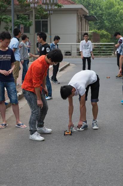 活动第一环节是实地操作环节:“我最快”,每组选手分别在机械楼下平地上和坡道上遥控自己的小车,测算相同距离所耗时间,时间越短成绩越高。在实地操作环节,大部分组的小车都成功完成了规定距离,但在速度上参差不齐,来自机械公司的陈福广小组和电子信息公司的俞哲文小组速度最快,引来赛道两边观众的频频叫好。有些小组的小车虽然速度较慢,但队员们并没有中途放弃,而是紧跟在小车后操纵遥控,大家也为他们的坚持而打气。坡道环节,由于马力不够,有一部分选手的小车爬到一半就滑落了,在观众的期待中,来自机械公司陈福广小组的小车爬坡时却如履平地,不仅成功行走了两米,速度也非常快,赛道两旁响起热烈的掌声。这个环节考验了选手的动手能力及对专业知识的掌握。第二环节是PP展示演讲环节:“讲一讲”,每组选手派一名代表用PPT来讲解制作小车的过程、遇到的困难及解决的办法。令人印象深刻的是,来自测绘公司的於一峰同学给观众仔细演说了制作小车的各个步骤,还提到注意事项,让观众们真正了解到小车诞生的不易经过。来自机械公司的陈福广同学向大家再现了制作现场,看到团队一起拼接小车的照片,遇到困难时的苦脸及解决问题后的笑脸,观众席中不时爆发出阵阵掌声。其他各个小组也有精彩表现。